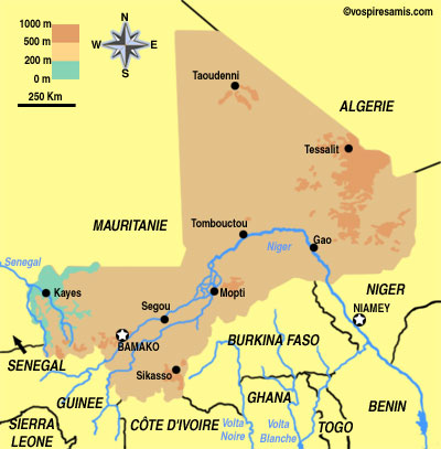 Pays Limitrophes : Algérie 1.376 Km, Burkina Faso 1.000 Km, Côte dIvoire 532 Km, Guinée 858 Km, Mauritanie 2.237 Km, Niger 821Km, Sénégal 419 Km.