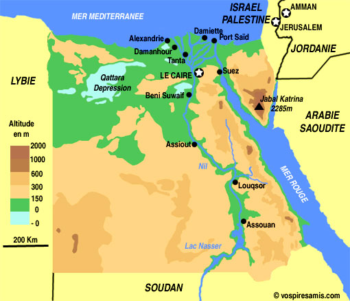 Pays Limitrophes : Palestine (Gaza) 11 Km, Israël 266 Km, Libye 1.115 Km, Soudan 1.273 Km.